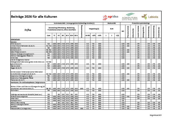 Die von Agridea und Agrofutura erstellte Übersichtstabelle zeigt alle Beiträge für alle Kulturen – klar strukturiert nach Beitragsarten und einfach vergleichbar. Ideal für Planung und Beratung.
